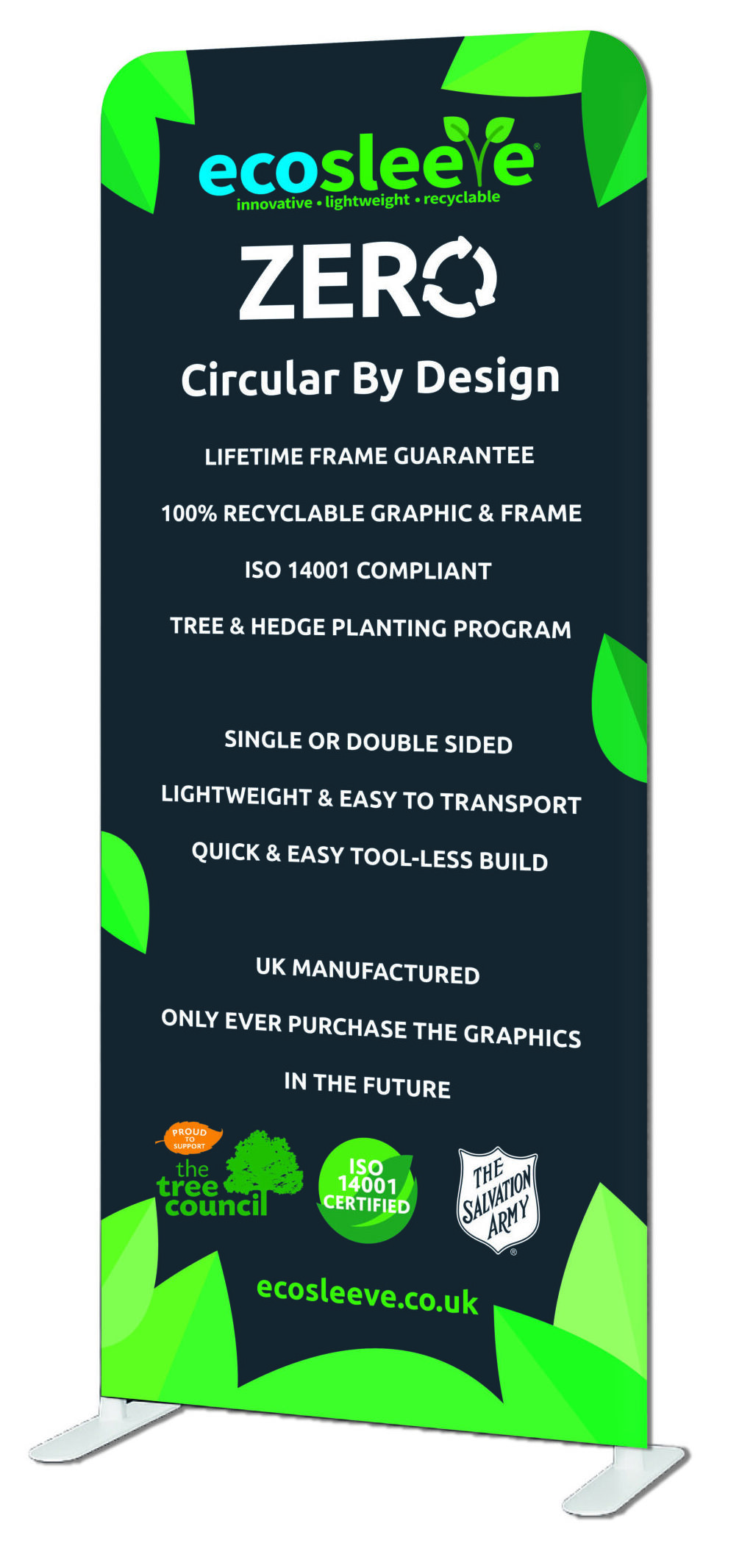 Welcome to the future of sustainable display solutions. Our EcoSleeve ZERO stands are manufactured in the UK from European aluminium with a lifetime guarantee. Only ever purchase the hardware once.